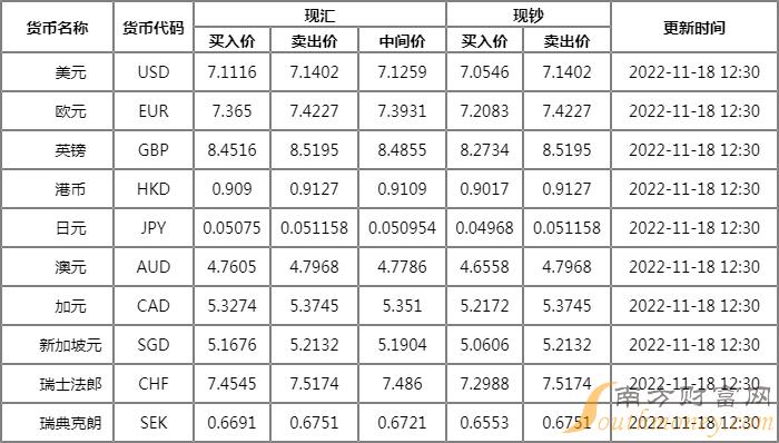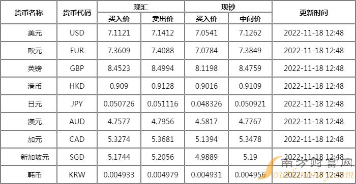 2022年11月18日银行间外汇市场人民币汇率中间价为:1美元对人民币7.1091元,1欧元对人民币7.3626元,100日元对人民币5.0640元,1港元对人民币0.90823元,1英镑对人民币8.4369元,1澳大利亚元对人民币4.7556元,1新西兰元对人民币4.3616元,1新加坡元对人民币5.1730元,1瑞士法郎对人民币7.4654元,1加拿大元对人民币5.3369元,人民币1元对0.64188马来西亚林吉特,人民币1元对8.4292俄罗斯卢布,人民币1元对2.4429南非兰特,人民币1元对188.25韩元,人民币1元对0.51732阿联酋迪拉姆,人民币1元对0.52939沙特里亚尔,人民币1元对55.9703匈牙利福林,人民币1元对0.64053波兰兹罗提,人民币1元对1.0109丹麦克朗,人民币1元对1.4913瑞典克朗,人民币1元对1.4247挪威克朗,人民币1元对2.62065土耳其里拉,人民币1元对2.7331墨西哥比索,人民币1元对5.0345泰铢。