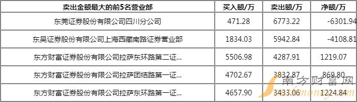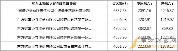 今日上榜营业部中,第一大买入营业部为国盛证券有限责任公司宁波桑田路证券营业部,买入金额为6337.53万元,第一大卖出营业部为东莞证券股份有限公司四川分公司,卖出金额为6773.22万元。