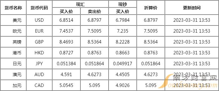 血盆大口的人字拖 邮储银行外汇牌价表03.31 人民币的汇率是多少?侃财君整理如下: