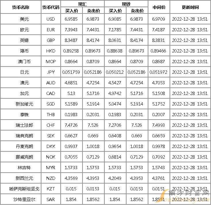 2022年12月28日银行间外汇市场人民币汇率中间价为:1美元对人民币6.9681元,1欧元对人民币7.4090元,100日元对人民币5.2183元,1港元对人民币0.89328元,1英镑对人民币8.3774元,1澳大利亚元对人民币4.6875元,1新西兰元对人民币4.3683元,1新加坡元对人民币5.1707元,1瑞士法郎对人民币7.4963元,1加拿大元对人民币5.1530元,人民币1元对0.63509马来西亚林吉特,人民币1元对9.9636俄罗斯卢布,人民币1元对2.4704南非兰特,人民币1元对182.46韩元,人民币1元对0.52712阿联酋迪拉姆,人民币1元对0.53943沙特里亚尔,人民币1元对54.1121匈牙利福林,人民币1元对0.63166波兰兹罗提,人民币1元对1.0038丹麦克朗,人民币1元对1.5033瑞典克朗,人民币1元对1.4100挪威克朗,人民币1元对2.68086土耳其里拉,人民币1元对2.7956墨西哥比索,人民币1元对4.9684泰铢。