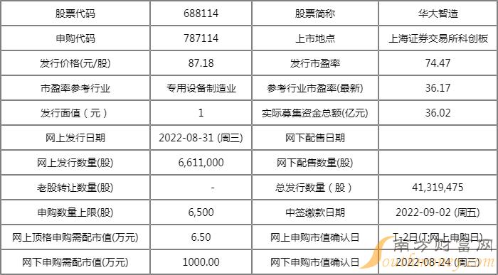 华大智造(股票代码688114,申购代码787114)网上申购日期8月31日,发行4131.95万股,其中网上发行661.1万股,申购上限6500股,网上顶格申购需配市值6.5万元。