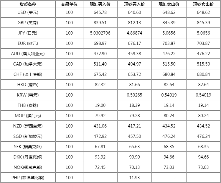 本牌价仅供参考,以银行各分行实际交易汇率为准。