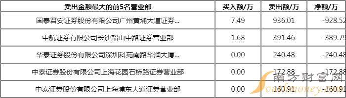 上榜的前五大买卖营业部合计成交3475.57万元,占该股当天成交总金额的比例为24.08%,其中,买入成交额为1565.99万元,卖出成交额为1909.58万元,合计净卖出343.59万元。