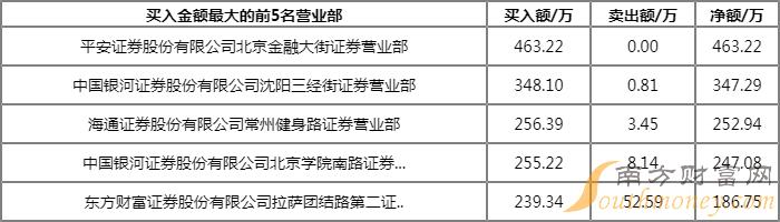 今日上榜营业部中,第一大买入营业部为平安证券股份有限公司北京金融大街证券营业部,买入金额为463.22万元,第一大卖出营业部为国泰君安证券股份有限公司广州黄埔大道证券营业部,卖出金额为936.02万元。