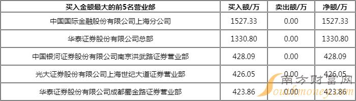 今日上榜营业部中,第一大买入营业部为中国国际金融股份有限公司上海分公司,买入金额为1527.33万元,第一大卖出营业部为华泰证券股份有限公司总部,卖出金额为1111.75万元。