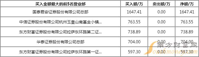 今日上榜营业部中,第一大买入营业部为国泰君安证券股份有限公司总部,买入金额为1647.41万元,第一大卖出营业部为东方财富证券股份有限公司拉萨东环路第二证券营业部,卖出金额为835.28万元。