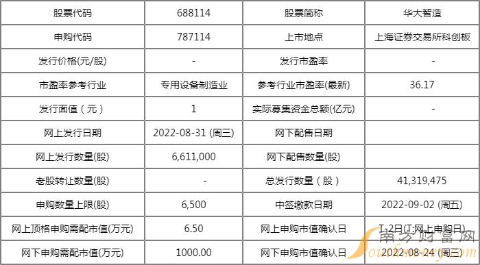 证券简称华大智造,证券代码688114,申购代码787114,申购日期2022年8月31日,发行数量4131.95万股,上网发行数量661.1万股,个人申购上限6500股。
