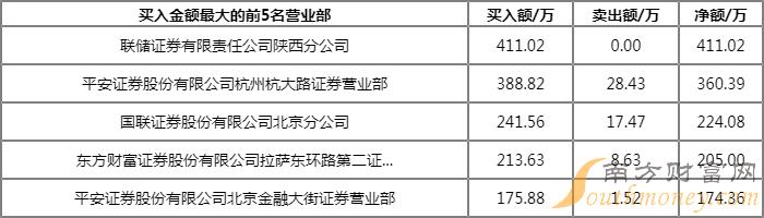 今日上榜营业部中,第一大买入营业部为联储证券有限责任公司陕西分公司,买入金额为411.02万元,第一大卖出营业部为山西证券股份有限公司介休北坛中路证券营业部,卖出金额为600.44万元。