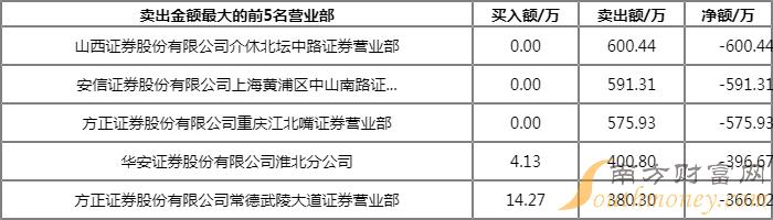 上榜的前五大买卖营业部合计成交4054.15万元,占该股当天成交总金额的比例为29.73%,其中,买入成交额为1449.32万元,卖出成交额为2604.83万元,合计净卖出1155.52万元。