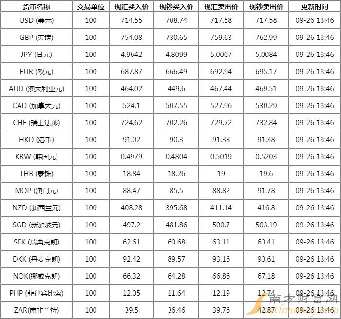 通西红柿 中国银行外汇牌价表 9月26日中行汇率查询,下面同吾浦君来看看。