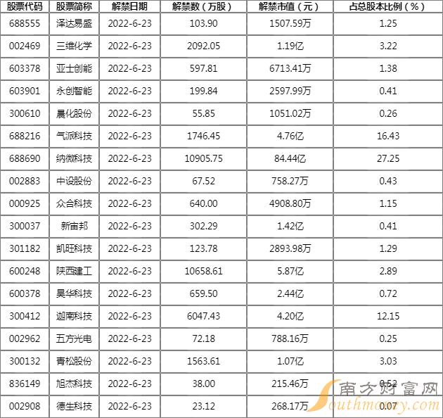 6月23日(下个交易日)限售股解禁一览: