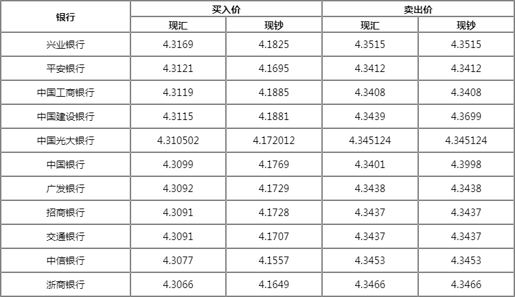结汇最优:兴业 汇率: 4.31691000新西兰元现汇可结汇为4316.90人民币