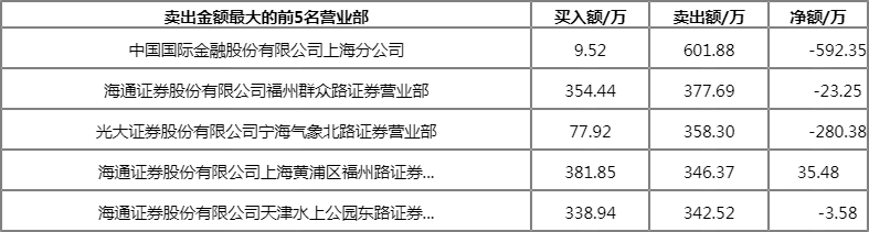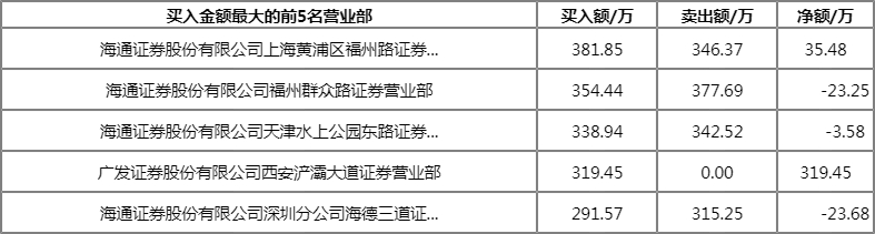 今日上榜营业部中,第一大买入营业部为海通证券股份有限公司上海黄浦区福州路证券营业部,买入金额为381.85万元,第一大卖出营业部为中国国际金融股份有限公司上海分公司,卖出金额为601.88万元。