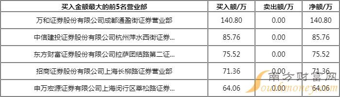 今日上榜营业部中,第一大买入营业部为万和证券股份有限公司成都通盈街证券营业部,买入金额为140.80万元,第一大卖出营业部为安信证券股份有限公司西安曲江池南路证券营业部,卖出金额为640.00万元。