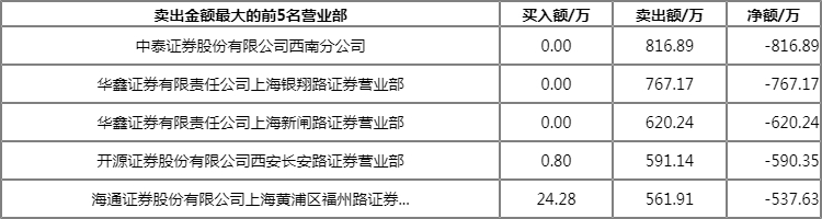 上榜的前五大买卖营业部合计成交6774.12万元,占该股当天成交总金额的比例为23.33%,其中,买入成交额为3144.24万元,卖出成交额为3629.88万元,合计净卖出485.64万元。