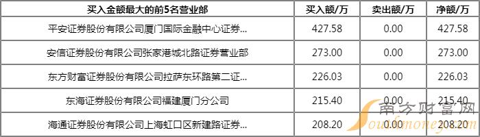 今日上榜营业部中,第一大买入营业部为平安证券股份有限公司厦门国际金融中心证券营业部,买入金额为427.58万元,第一大卖出营业部为中国国际金融股份有限公司上海分公司,卖出金额为824.05万元。