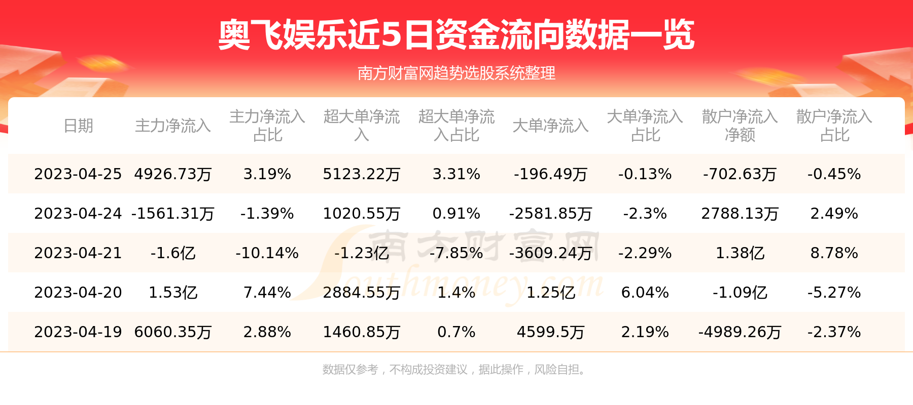 4月25日消息,奥飞娱乐4月25日主力资金净流入4926.73万元,超大单资金净流入5123.22万元,大单资金净流出196.49万元,散户资金净流出702.63万元。