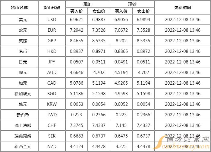 12月8日,2022年12月8日银行间外汇市场人民币汇率中间价为:1美元对人民币6.9606元,前一交易日中间价报6.9975元,单日调升369基点。