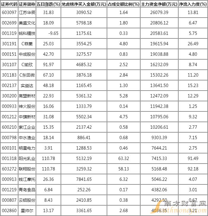部分个股在龙虎榜的机构或营业部中显示出有资金在净买入,并且期间主力资金还在净流入,两方面都说明这些个股受到主力资金青睐。在近五日龙虎榜机构或营业部净买入的77只个股中,主力资金同期净流入的个股有51只,净流入金额最大的个股为江苏华辰、美盛文化、铭科精技,主力资金分别为2.61亿元、2.08亿元、2.06亿元。主力资金净流入力度较大的个股有联翔股份、阳光乳业、科陆电子,力度分别高达92.18%、91.49%、46.69%。