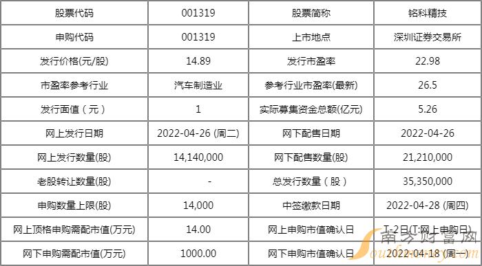 据消息,铭科精技申购时间为2022年4月26日,股票代码和申购代码均为001319。铭科精技本次拟公开发行不超过3535万股,不低于公司本次发行后总股本的25%,本次发行不安排原股东公开发售股份,发行后总股本不超过约1.41亿股。