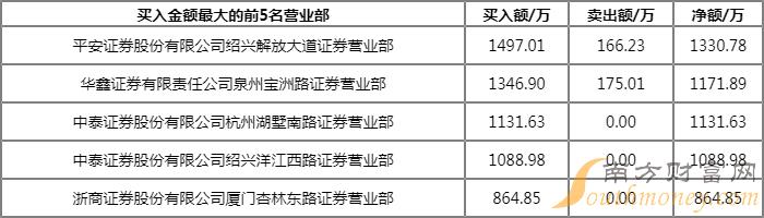 今日上榜营业部中,第一大买入营业部为平安证券股份有限公司绍兴解放大道证券营业部,买入金额为1497.01万元,第一大卖出营业部为首创证券股份有限公司四川分公司,卖出金额为1074.12万元。