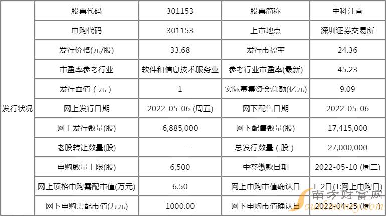 中科江南拟公开发行股票不超过2700万股,占发行后总股本的比例不低于25%。申购代码:301153,发行价格:暂无/股,单一账户申购上限6500股,顶格申购需配市值6.50万元。