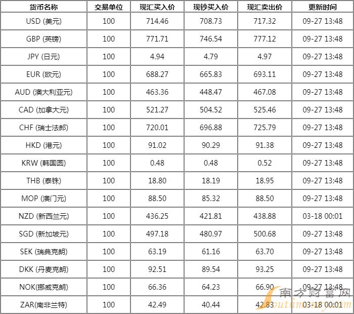 碧眼突出的蓉 中国农业银行 外汇牌价9月27日 人民币对美元汇率多少?下面同财言君来看看。