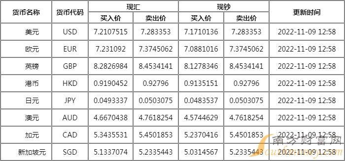 2022年11月9日银行间外汇市场人民币汇率中间价为:1美元对人民币7.2189元,1欧元对人民币7.2628元,100日元对人民币4.9569元,1港元对人民币0.91969元,1英镑对人民币8.3253元,1澳大利亚元对人民币4.6889元,1新西兰元对人民币4.2967元,1新加坡元对人民币5.1605元,1瑞士法郎对人民币7.3215元,1加拿大元对人民币5.3726元,人民币1元对0.65637马来西亚林吉特,人民币1元对8.4659俄罗斯卢布,人民币1元对2.4571南非兰特,人民币1元对190.86韩元,人民币1元对0.50958阿联酋迪拉姆,人民币1元对0.52154沙特里亚尔,人民币1元对55.4451匈牙利福林,人民币1元对0.64689波兰兹罗提,人民币1元对1.0251丹麦克朗,人民币1元对1.4921瑞典克朗,人民币1元对1.4209挪威克朗,人民币1元对2.57188土耳其里拉,人民币1元对2.7152墨西哥比索,人民币1元对5.1258泰铢。