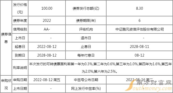 消息显示,本次拟发行可转债募集资金总额为人民币3亿元,发行数量为830万张。票面价格:本次发行的可转换公司债券每张面值为人民币100元,按面值发行。本次发行的可转债期限为自发行之日起六年,即自2022年8月12日至2028年8月11日。本次发行的可转债票面利率第一年为0.3%,第二年为0.6%,第三年为1%,第四年为6%,第五年为2%,第六年为5%。本次发行的可转债转股期限自发行结束之日2022年8月18日满六个月后的第一个交易日起,至可转债到期日止。