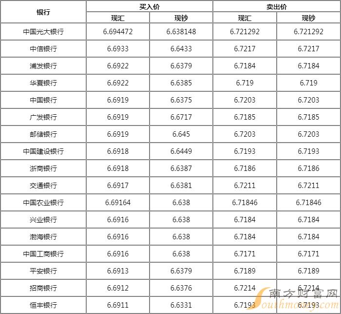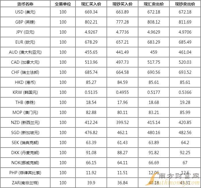 今日美元银行牌价表