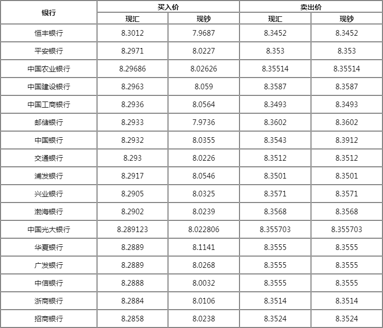 结汇最优:恒丰 汇率: 8.30121000英镑现汇可结汇为8301.20人民币