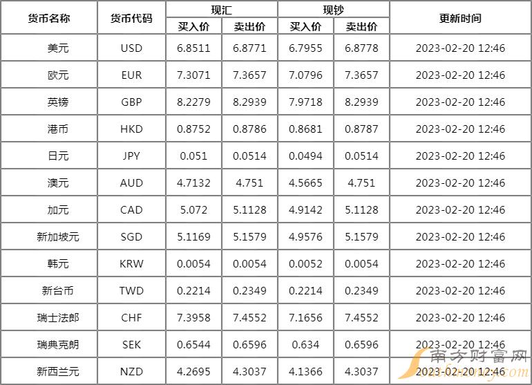 2023年2月20日银行间外汇市场人民币汇率中间价为:1美元对人民币6.8643元,1欧元对人民币7.3330元,100日元对人民币5.1102元,1港元对人民币0.87535元,1英镑对人民币8.2569元,1澳大利亚元对人民币4.7147元,1新西兰元对人民币4.2794元,1新加坡元对人民币5.1349元,1瑞士法郎对人民币7.4228元,1加拿大元对人民币5.0905元,人民币1元对0.64499马来西亚林吉特,人民币1元对10.7597俄罗斯卢布,人民币1元对2.6302南非兰特,人民币1元对189.03韩元,人民币1元对0.53510阿联酋迪拉姆,人民币1元对0.54636沙特里亚尔,人民币1元对52.3617匈牙利福林,人民币1元对0.64930波兰兹罗提,人民币1元对1.0155丹麦克朗,人民币1元对1.5238瑞典克朗,人民币1元对1.5003挪威克朗,人民币1元对2.74525土耳其里拉,人民币1元对2.6764墨西哥比索,人民币1元对5.0191泰铢。