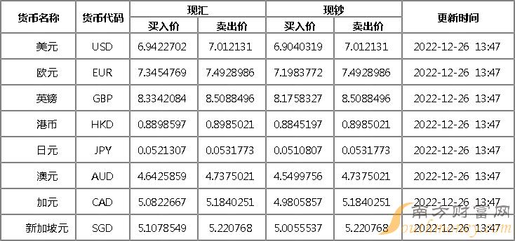 2022年12月28日银行间外汇市场人民币汇率中间价为:1美元对人民币6.9681元,1欧元对人民币7.4090元,100日元对人民币5.2183元,1港元对人民币0.89328元,1英镑对人民币8.3774元,1澳大利亚元对人民币4.6875元,1新西兰元对人民币4.3683元,1新加坡元对人民币5.1707元,1瑞士法郎对人民币7.4963元,1加拿大元对人民币5.1530元,人民币1元对0.63509马来西亚林吉特,人民币1元对9.9636俄罗斯卢布,人民币1元对2.4704南非兰特,人民币1元对182.46韩元,人民币1元对0.52712阿联酋迪拉姆,人民币1元对0.53943沙特里亚尔,人民币1元对54.1121匈牙利福林,人民币1元对0.63166波兰兹罗提,人民币1元对1.0038丹麦克朗,人民币1元对1.5033瑞典克朗,人民币1元对1.4100挪威克朗,人民币1元对2.68086土耳其里拉,人民币1元对2.7956墨西哥比索,人民币1元对4.9684泰铢。