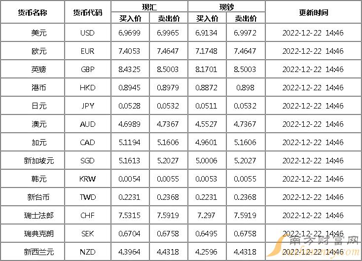 2022年12月22日银行间外汇市场人民币汇率中间价为:1美元对人民币6.9713元,1欧元对人民币7.3964元,100日元对人民币5.2684元,1港元对人民币0.89508元,1英镑对人民币8.4230元,1澳大利亚元对人民币4.6773元,1新西兰元对人民币4.3845元,1新加坡元对人民币5.1603元,1瑞士法郎对人民币7.5256元,1加拿大元对人民币5.1225元,人民币1元对0.63626马来西亚林吉特,人民币1元对10.1334俄罗斯卢布,人民币1元对2.4657南非兰特,人民币1元对183.59韩元,人民币1元对0.52683阿联酋迪拉姆,人民币1元对0.53951沙特里亚尔,人民币1元对54.3686匈牙利福林,人民币1元对0.62999波兰兹罗提,人民币1元对1.0057丹麦克朗,人民币1元对1.4943瑞典克朗,人民币1元对1.4106挪威克朗,人民币1元对2.67765土耳其里拉,人民币1元对2.8196墨西哥比索,人民币1元对4.9736泰铢。