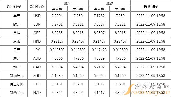 2022年11月9日银行间外汇市场人民币汇率中间价为:1美元对人民币7.2189元,1欧元对人民币7.2628元,100日元对人民币4.9569元,1港元对人民币0.91969元,1英镑对人民币8.3253元,1澳大利亚元对人民币4.6889元,1新西兰元对人民币4.2967元,1新加坡元对人民币5.1605元,1瑞士法郎对人民币7.3215元,1加拿大元对人民币5.3726元,人民币1元对0.65637马来西亚林吉特,人民币1元对8.4659俄罗斯卢布,人民币1元对2.4571南非兰特,人民币1元对190.86韩元,人民币1元对0.50958阿联酋迪拉姆,人民币1元对0.52154沙特里亚尔,人民币1元对55.4451匈牙利福林,人民币1元对0.64689波兰兹罗提,人民币1元对1.0251丹麦克朗,人民币1元对1.4921瑞典克朗,人民币1元对1.4209挪威克朗,人民币1元对2.57188土耳其里拉,人民币1元对2.7152墨西哥比索,人民币1元对5.1258泰铢。