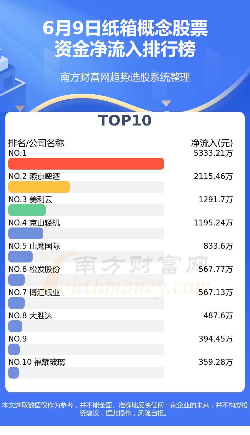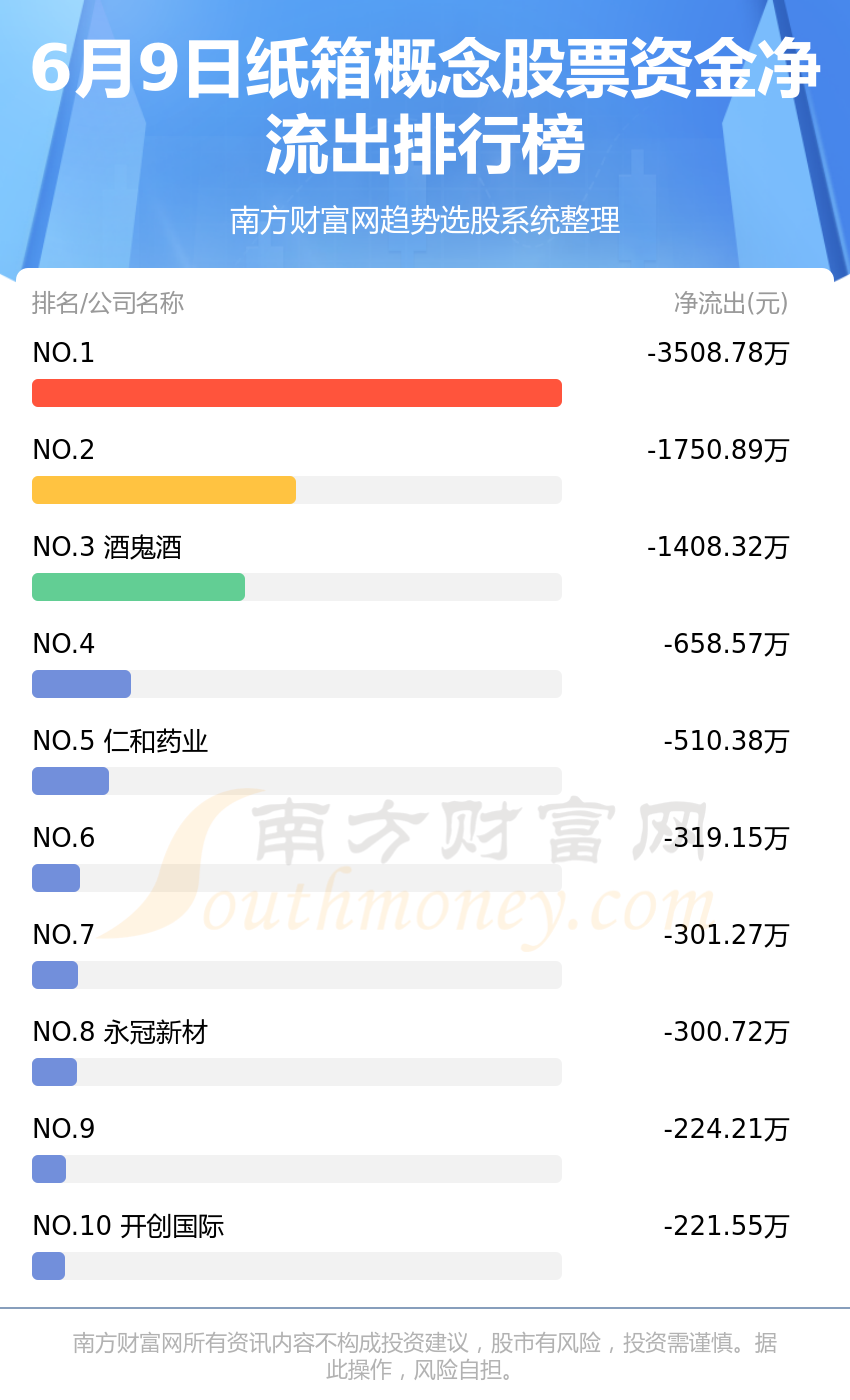 纸箱概念股票6月9日资金净流出情况来看,广博股份位列第一位,主力净流出达到-3508.78万元;申通快递排名第二,主力净流出为-1750.89万元;酒鬼酒排名第三,主力净流出-1408.32万元。主力净流出排名前10的还有:东方精工、仁和药业、北化股份、美盈森、永冠新材、凯龙股份、开创国际。