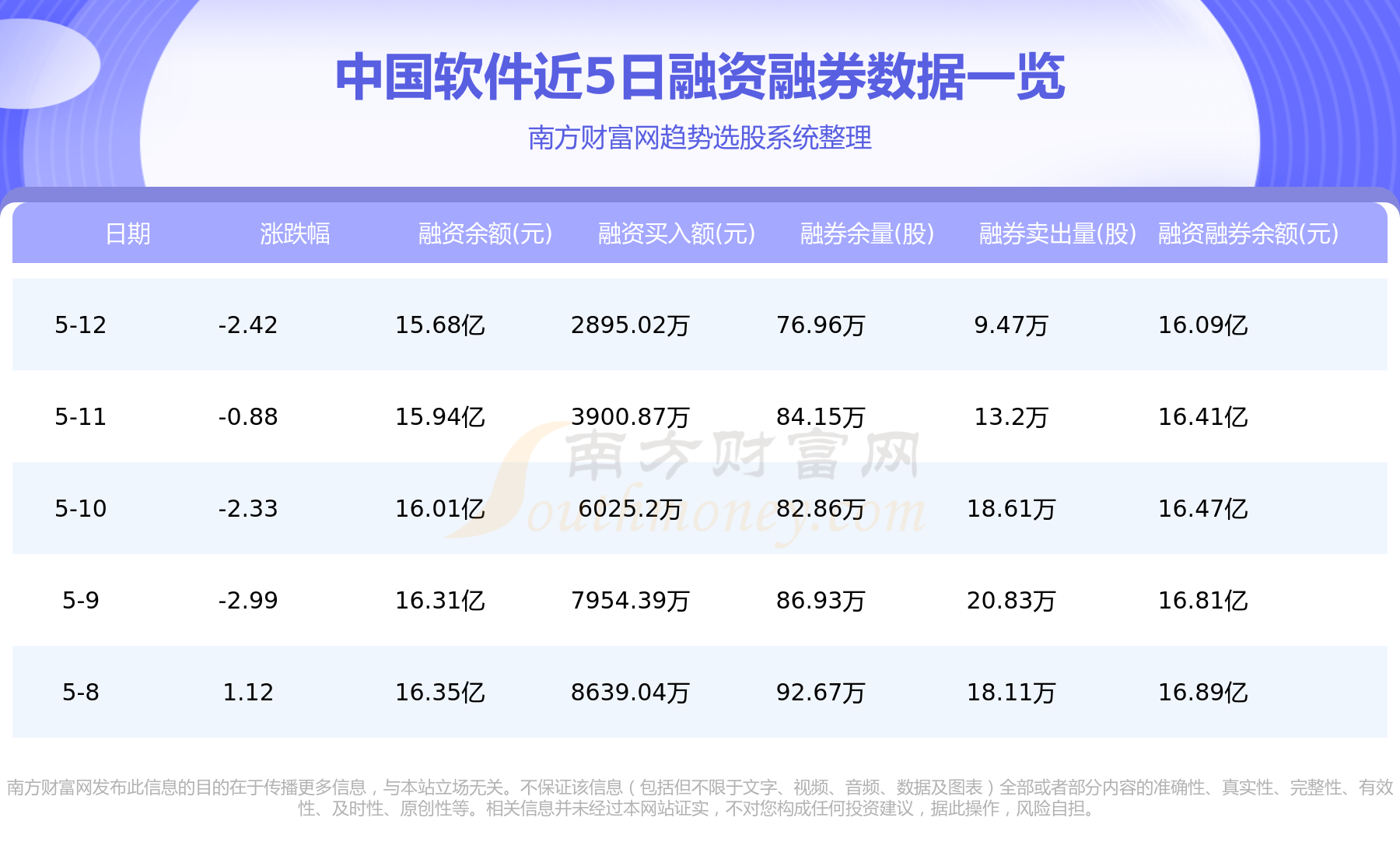 中国软件5月12日融券信息显示,融资方面,当日融资买入2895.02万元,融资偿还5552.25万元,融资净买额-2657.23万元。融券方面,融券卖出9.47万股,融券偿还16.66万股,融券余量76.96万股,融券余额4155.74万元。融资融券余额16.09亿元。近5日融资融券数据一览见下表: