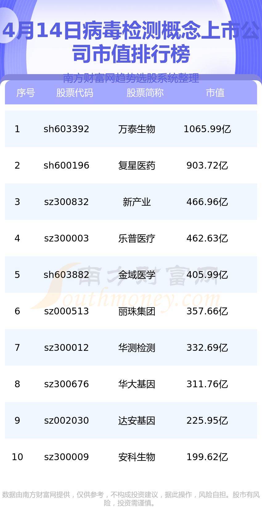 池小蝌蚪 《趋势选股系统》股票工具数据整理,截至4月14日,病毒检测概念上市公司市值排行榜情况如下(数据仅供参考):