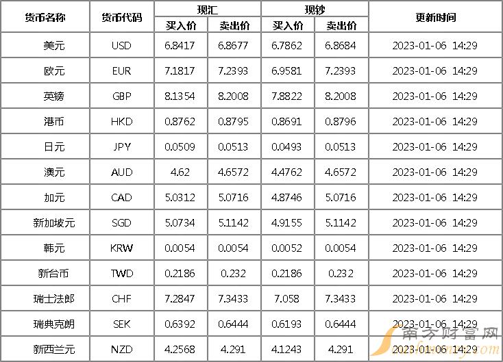 2023年1月9日银行间外汇市场人民币汇率中间价为1美元对人民币6.8265元,1欧元对人民币7.2718元,100日元对人民币5.1703元,1港元对人民币0.87431元,1英镑对人民币8.2607元,1澳大利亚元对人民币4.7017元,1新西兰元对人民币4.3344元,1新加坡元对人民币5.1179元,1瑞士法郎对人民币7.3623元,1加拿大元对人民币5.0790元,人民币1元对0.64286林吉特,人民币1元对10.6215俄罗斯卢布,人民币1元对2.5086南非兰特,人民币1元对183.87韩元,人民币1元对0.53813阿联酋迪拉姆,人民币1元对0.55064沙特里亚尔,人民币1元对54.2628匈牙利福林,人民币1元对0.64547波兰兹罗提,人民币1元对1.0228丹麦克朗,人民币1元对1.5425瑞典克朗,人民币1元对1.4661挪威克朗,人民币1元对2.74980土耳其里拉,人民币1元对2.8046墨西哥比索,人民币1元对4.9303泰铢。