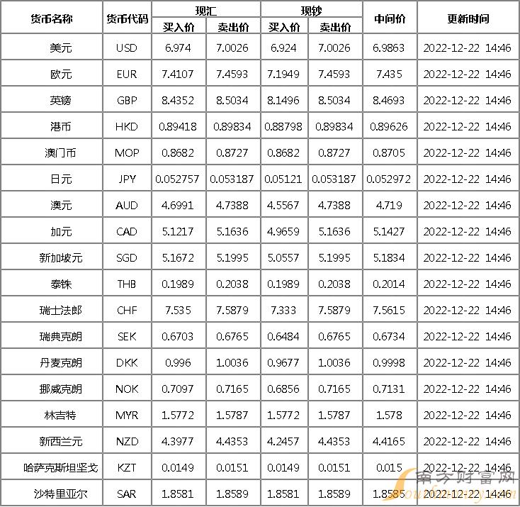 2022年12月22日银行间外汇市场人民币汇率中间价为:1美元对人民币6.9713元,1欧元对人民币7.3964元,100日元对人民币5.2684元,1港元对人民币0.89508元,1英镑对人民币8.4230元,1澳大利亚元对人民币4.6773元,1新西兰元对人民币4.3845元,1新加坡元对人民币5.1603元,1瑞士法郎对人民币7.5256元,1加拿大元对人民币5.1225元,人民币1元对0.63626马来西亚林吉特,人民币1元对10.1334俄罗斯卢布,人民币1元对2.4657南非兰特,人民币1元对183.59韩元,人民币1元对0.52683阿联酋迪拉姆,人民币1元对0.53951沙特里亚尔,人民币1元对54.3686匈牙利福林,人民币1元对0.62999波兰兹罗提,人民币1元对1.0057丹麦克朗,人民币1元对1.4943瑞典克朗,人民币1元对1.4106挪威克朗,人民币1元对2.67765土耳其里拉,人民币1元对2.8196墨西哥比索,人民币1元对4.9736泰铢。