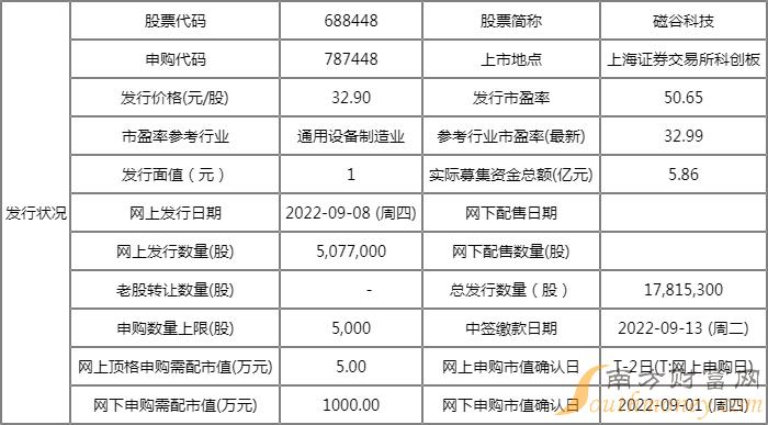 磁谷科技此次IPO拟公开发行股份1781.53万股,其中,网上发行数量为507.7万股,网下配售数量为1184.75万股,申购代码为787448,申购数量上限为5000股,网上顶格申购需配市值为5万元。