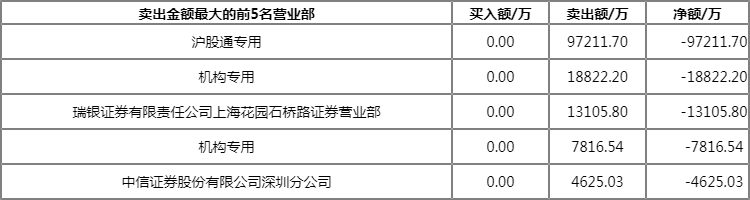 上榜的前五大买卖营业部合计成交21.54亿元,占该股当天成交总金额的比例为68.46%,其中,买入成交额为7.39亿元,卖出成交额为14.16亿元,合计净卖出6.77亿元。
