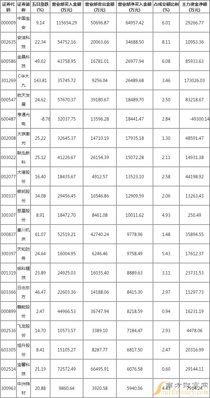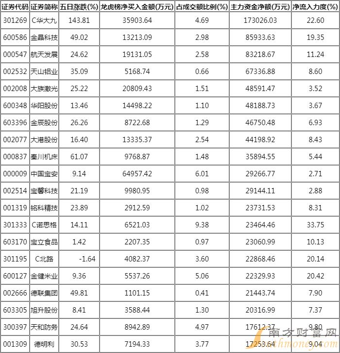 乌黑眸子的舒 近五日龙虎榜净买入个股主力资金流入排名