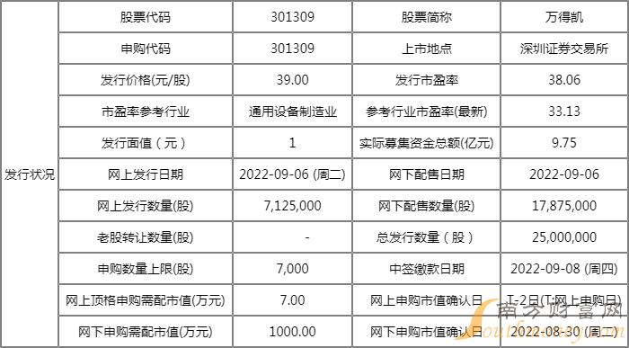 万得凯(股票代码:301309,申购代码:301309)将于9月6日进行网上申购,发行量为2500万股,网上发行712.5万股,发行价39元/股,发行市盈率38.06倍,申购上限7000股,网上顶格申购需配市值7万元。