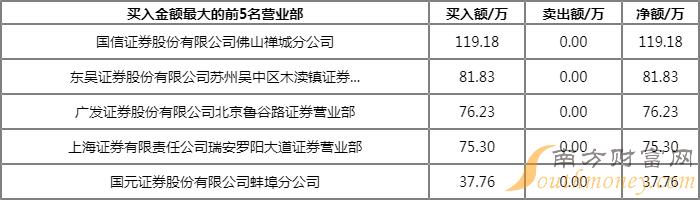 今日上榜营业部中,第一大买入营业部为国信证券股份有限公司佛山禅城分公司,买入金额为119.18万元,第一大卖出营业部为中国银河证券股份有限公司扬州文昌中路证券营业部,卖出金额为408.36万元。