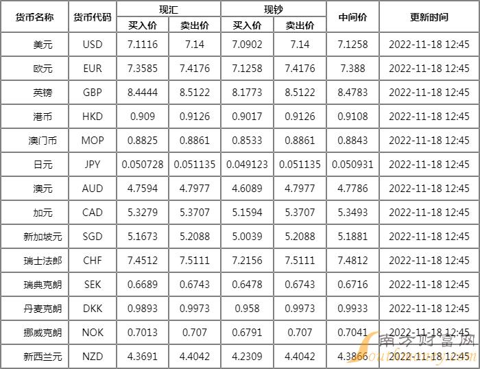 2022年11月18日银行间外汇市场人民币汇率中间价为:1美元对人民币7.1091元,1欧元对人民币7.3626元,100日元对人民币5.0640元,1港元对人民币0.90823元,1英镑对人民币8.4369元,1澳大利亚元对人民币4.7556元,1新西兰元对人民币4.3616元,1新加坡元对人民币5.1730元,1瑞士法郎对人民币7.4654元,1加拿大元对人民币5.3369元,人民币1元对0.64188马来西亚林吉特,人民币1元对8.4292俄罗斯卢布,人民币1元对2.4429南非兰特,人民币1元对188.25韩元,人民币1元对0.51732阿联酋迪拉姆,人民币1元对0.52939沙特里亚尔,人民币1元对55.9703匈牙利福林,人民币1元对0.64053波兰兹罗提,人民币1元对1.0109丹麦克朗,人民币1元对1.4913瑞典克朗,人民币1元对1.4247挪威克朗,人民币1元对2.62065土耳其里拉,人民币1元对2.7331墨西哥比索,人民币1元对5.0345泰铢。