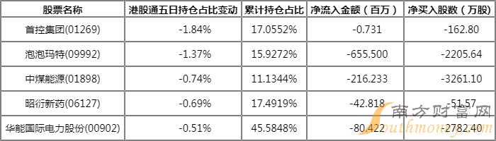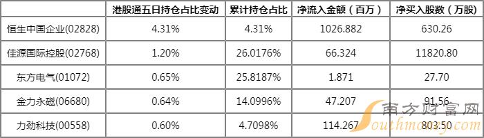 恒生中国企业(02828),佳源国际控股(02768),东方电气(01072),金力永磁(06680),力劲科技(00558)港股通五日资金显著流入,五日持仓占比变动分别为,4.31%,1.20%,0.65%,0.64%,0.60%。此外,首控集团(01269),泡泡玛特(09992),中煤能源(01898),昭衍新药(06127),华能国际电力股份(00902)港股通五日资金显著流出,五日资金显著流出,五日持仓占比变动分别为,-1.84%,-1.37%,-0.74%,-0.69%,-0.51%。
