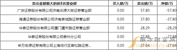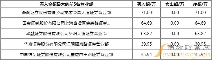 今日上榜营业部中,第一大买入营业部为浙商证券股份有限公司龙游荣昌大道证券营业部,买入金额为71.00万元,第一大卖出营业部为广发证券股份有限公司济南泺源大街证券营业部,卖出金额为57.80万元。