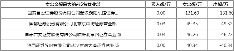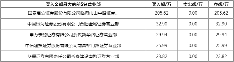 今日上榜营业部中,第一大买入营业部为国泰君安证券股份有限公司临海巾山中路证券营业部,买入金额为205.63万元,第一大卖出营业部为国泰君安证券股份有限公司武汉紫阳东路证券营业部,卖出金额为131.60万元。