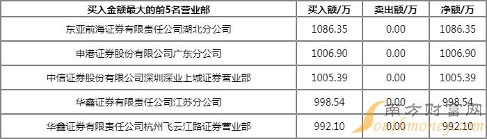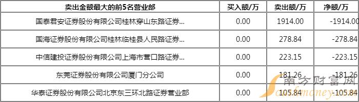 今日上榜营业部中,第一大买入营业部为东亚前海证券有限责任公司湖北分公司,买入金额为1086.35万元,第一大卖出营业部为国泰君安证券股份有限公司桂林穿山东路证券营业部,卖出金额为1914.00万元。